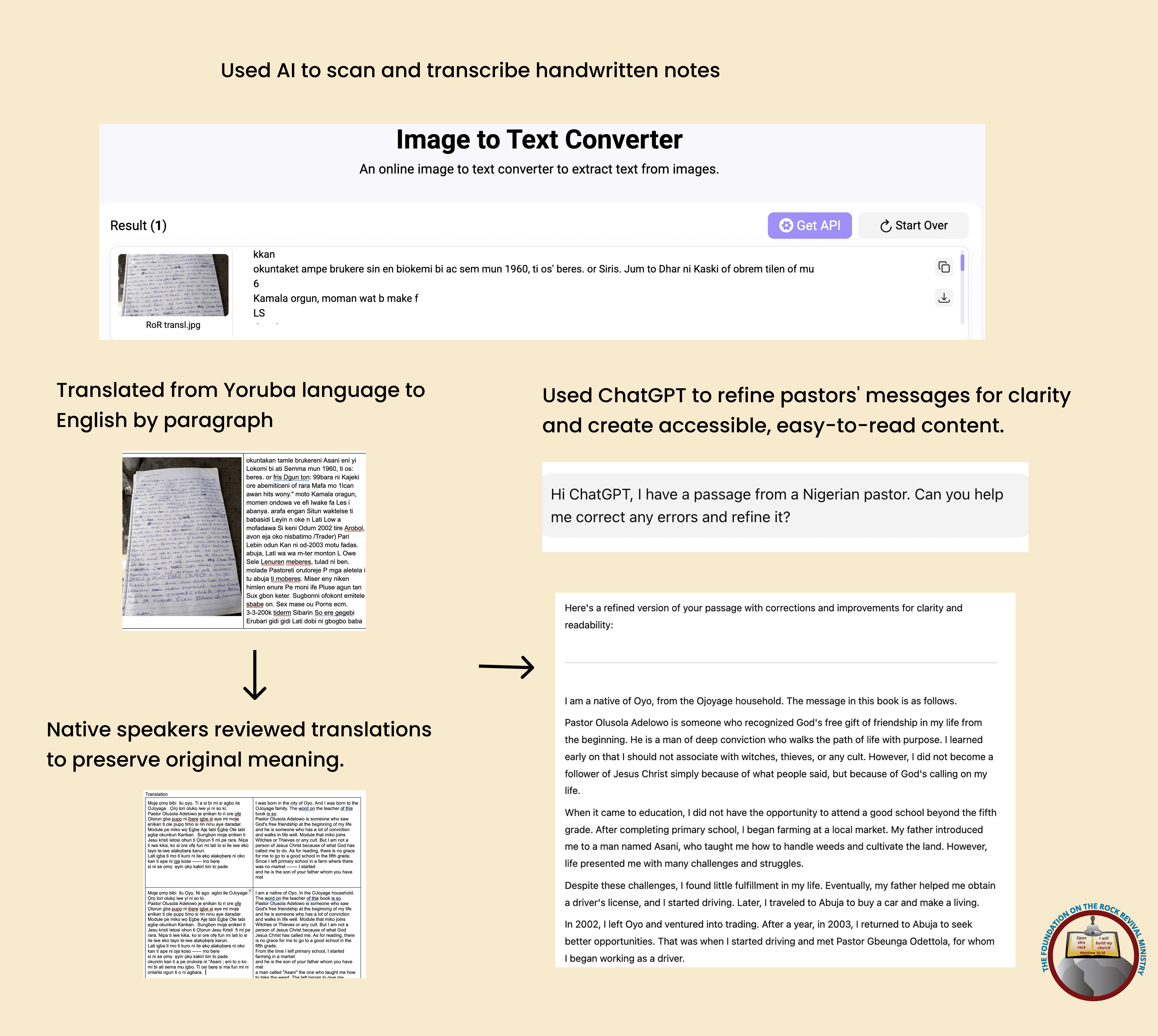 Finally, I used ChatGPT to refine the grammar and flow of the passages, ensuring the pastors' messages were delivered clearly and powerfully.